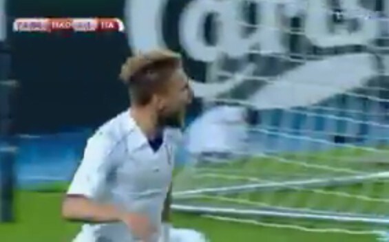 Ciro Immobile ristabilisce l'equilibrio tra Macedonia e Italia, segna di prima su cross di Candreva dalla destra; ecco la sua reazione.
