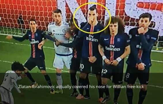 Ibrahimovic in barriera mentre il brasiliano Willian sta per battere una punizione per il Chelsea. Lo svedese, mentre i compagni si coprono il volto o le "parti basse", protegge il naso.