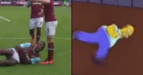 Michail Antonio, attaccante del West Ham, segna contro il Sunderland e celebra il gol in questa maniera divertente che ricorda molto uno sketch di una puntata dei Simpson in cui Homer si rotola a terra.