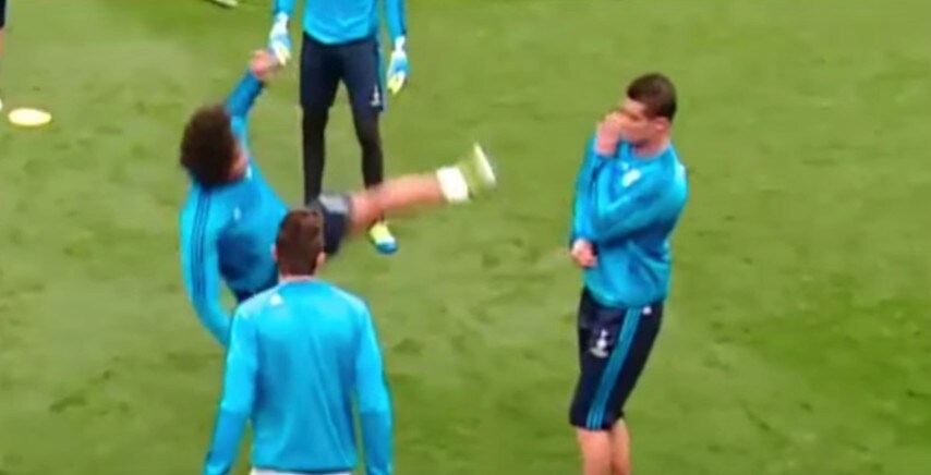 Un'entrata da karateka per Marcelo durante l'allenamento del Real Madrid. Cristiano Ronaldo non prova nemmeno l'intervento e dopo i due scherzano sul colpo del brasiliano,