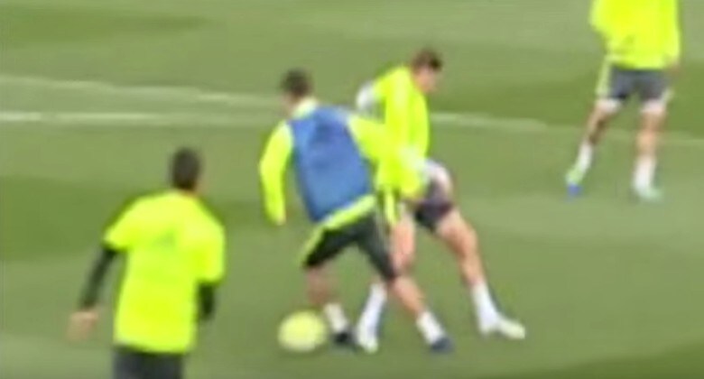 Durante la partitella d'allenamento, Cristiano Ronaldo ha un cliente scomodo. Il tedesco Toni Kroos non gli lascia scampo, così il portoghese deve inventarsi una finta improvvisa per avere qualche frazione di secondo di libertà.