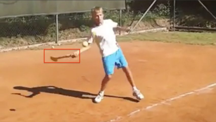 Gioca a tennis ma invece della racchetta usa qualcosa di veramente insolito: non crederete ai vostri occhi