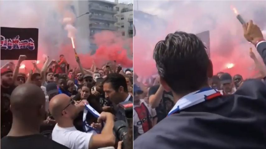 Grandissimo entusiasmo e un'accoglienza travolgente con fumogeni e cori da parte dei tifosi del Paris Saint-Germain a Gianluigi Buffon; il portiere si lascia travolgere e si improvvisa capo ultras accendendo una torcia.