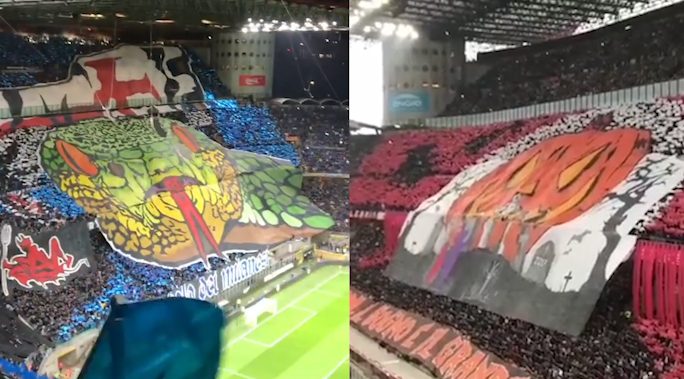Sfida a suon di coreografie tra Inter e Milan durante l'attesa sfida del "derby della Madonnina". I nerazzuri impressionano con un enorme serpente e dei piccoli diavoli che scappano via impauriti, mentre i rossoneri approfittano dell'imminente festività di Halloween per rappresentare una zucca spaventosa sullo sfondo di un cimitero.