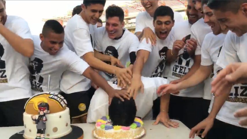 Diego Armando Maradona viene festeggiato dalla sua squadra: i calciatori del Dorados gli regalano una bella torta e indossano una maglietta con la sua immagine; e infine gli schiacciano la testa nella torta stessa.