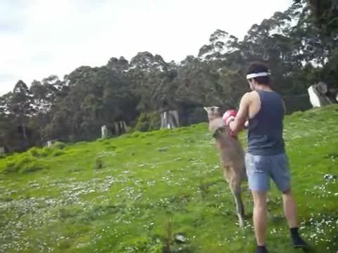 L'uomo indossa la sua tenuta da pugile e mette i guantoni per sfidare il canguro a boxe. Inizia il combattimento e l'animale non si tira indietro: i due "lottano" animatamente e quando il ragazzo sembra arrendersi e voler stringere la zampa all'avversario ecco che il canguro non molla. La scena è divertentissima.Fonte: https://www.youtube.com/watch?v=Uca_CKuTHQc