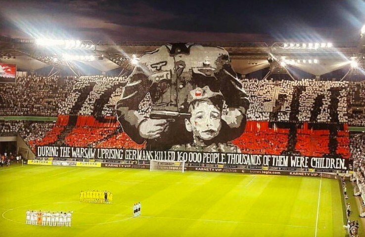 I tifosi del Legia Varsavia, in occasione del ritorno del 3° turno preliminare di Champions League con l'Astana, hanno esibito una coreografia molto dura, che richiamo uno dei periodi più bui dell'Europa durante la Seconda Guerra Mondiale e l'occupazione della Polonia da parte dei nazisti e la rivolta popolare scoppiata il 1° agosto del 1944. In Curva uno striscione recitava: "Durante la Rivolta di Varsavia i tedeschi uccisero 160mila persone. Migliaia di esse erano bambini". Ad alto impatto emotivo l'immagine del ragazzino minacciato da un nazista che gli punta una pistola alla tempia. Video tratto dal canale youtube Ultras' Life all'indirizzo https://www.youtube.com/watch?v=2A0RkGb403o