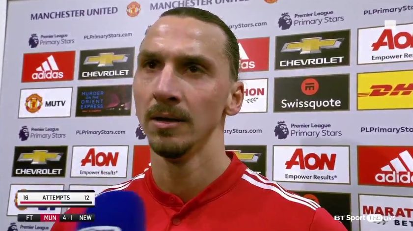 Dopo il ritorno in campo, Zlatan Ibrahimovic risponde così al termine della gara. Fonte video: https://twitter.com/btsportfootball/status/931970725371559936?ref_src=twsrc%5Etfw&ref_url=http%3A%2F%2Fwww.eurosport.com%2Ffootball%2Flions-don-t-recover-like-humans-says-ibrahimovic-after-united-return_sto6414669%2Fstory.shtml