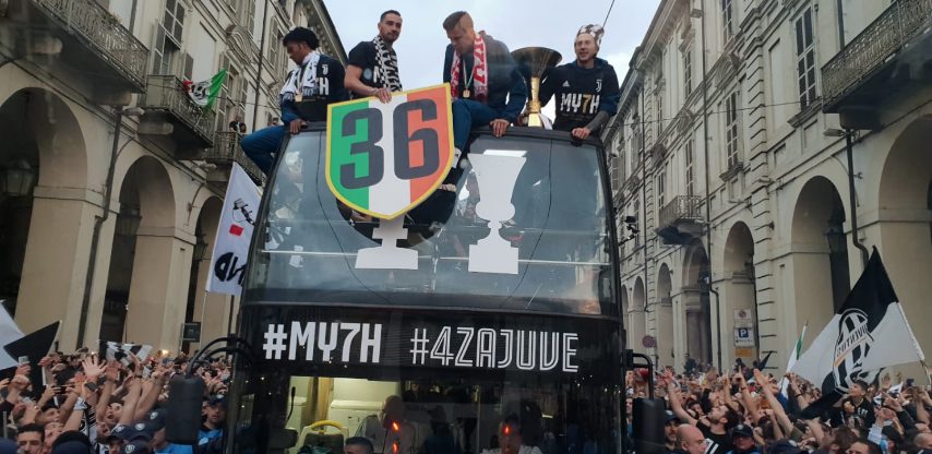 Juve, festa scudetto sul pullman scoperto: i giocatori mostrano il numero 36