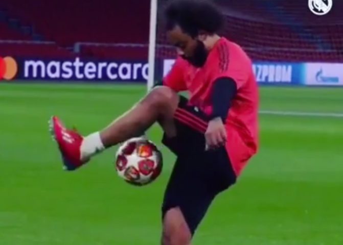 L'esterno brasiliano del Real Madrid in allenamento mostra le sue qualità tecniche. Mentre palleggia si produce in un gesto di altissima classe: il solito giro con la gamba attorno al pallone, fatto mentre la sfera tocca la coscia. Marcelo non perde mai il controllo del pallone da vero fuoriclasse