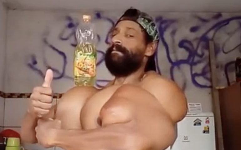 Non solo palestra e pesi, quest'uomo ha i muscoli così gonfi per le molte iniezioni di olio a cui si sottopone. Probabilmente si tratta di Synthol, un olio sintetico, anche se c'è addirittura chi ipotizza che possa trattarsi anche di un olio diverso.
