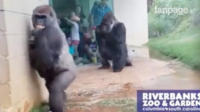 Inizia a piovere e alcuni gorilla dello zoo di Riverbanks scappano per ripararsi, imitando quasi un comportamento a noi molto familiare.