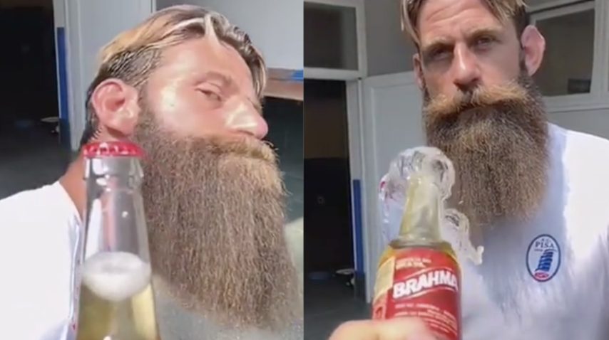 Davide Moscardelli, attaccante del Pisa, non rinuncia alla bottle cap challenge e lo fa con la sua lunga e folta barba.