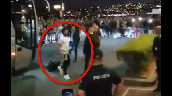 Tifosi azzurri radunati sotto l'Hotel Vesuvio per l'arrivo della squadra del Liverpool in vista della gara di Champions League. Tanti fischi per Salah quando scende dal pullman, di sicuro uno dei giocatori più temibili dei Reds.