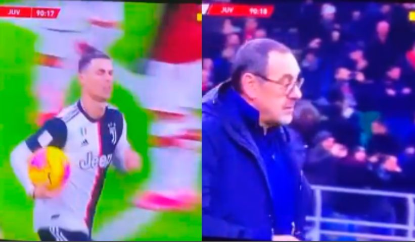 Nelle storie Instagram della compagna di Ronaldo ecco il momento in cui riprende il calcio di rigore contro il Milan e commenta la bellezza del portoghese; l'inquadratura stacca su Sarri e Georgina si lascia andare: "No, questo no".