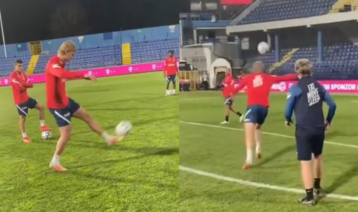 Il giovane attaccante norvegese, durante un allenamento della nazionale, dimostra ancora una volta la sua potenza.