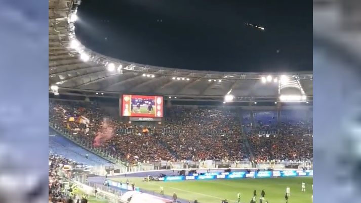 Mentre risuona l'inno della Roma durante la gara contro l'Atalanta, i tifosi ammirano il passaggio di un meteorite