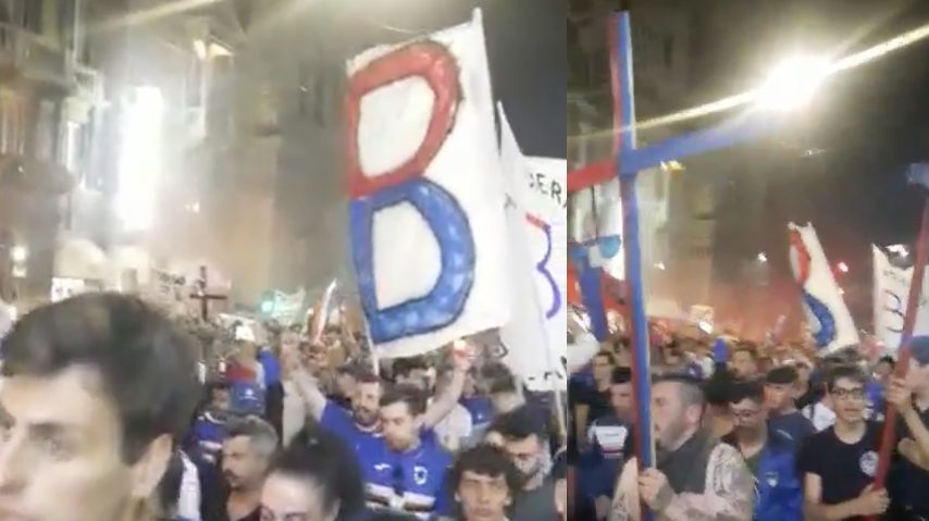 Lungo le strade di Genova i tifosi della Sampdoria festeggiano la permanenza in serie A e anche la retrocessione dei rivali rossoblu del Genoa. Cartelli con scritto B e croci.