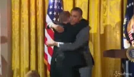 In occasione della serata per le Olimpiadi Speciali, organizzato alla Casa Bianca il presidente degli Usa, Obama ha abbandonato il suo aspetto diplomatico e abbraccia ragazzo down.