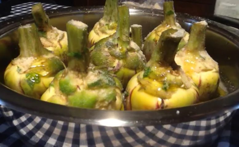 Mettete a scaldare l'olio con gli spicchi d'aglio e fate cuocere i carciofi a testa in giù aggiungendo sale, pepe, acqua e il pangrattato. Fate cuocere per 35 minuti.